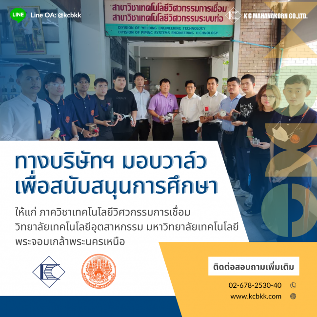 K C Mahanakorn Co., Ltd. has donated valves to support education for the Department of Welding Engineering Technology, College of Industrial Technology, King Mongkut’s University of Technology North Bangkok