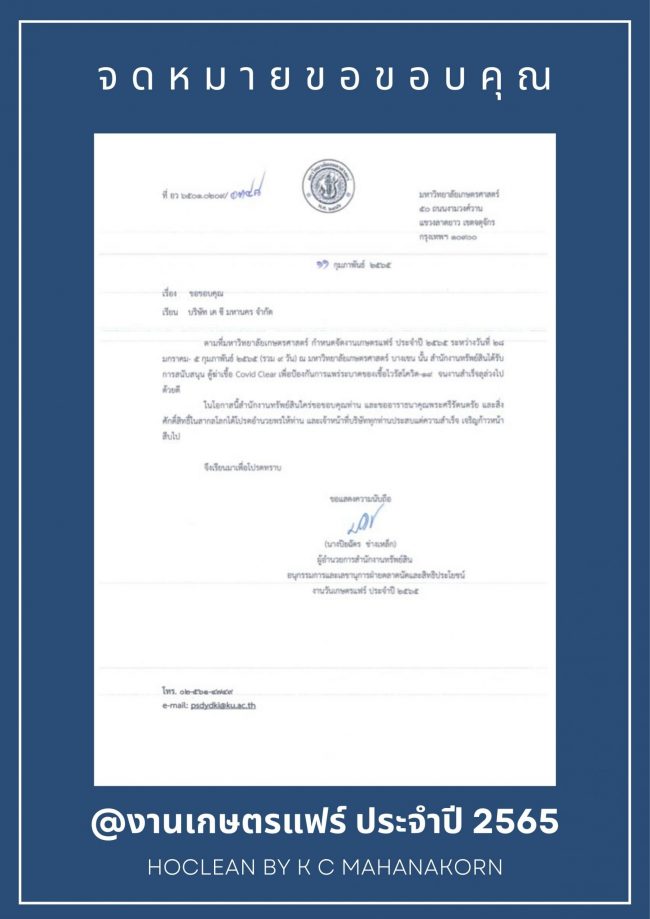 มหาวิทยาลัยเกษตรศาสตร์ขอขอบคุณ บริษัท เค ซี มหานคร จำกัด สนับสนุนตู้พ่นฆ่าเชื้อ @งานเกษตรแฟร์ ประจำปี 2565