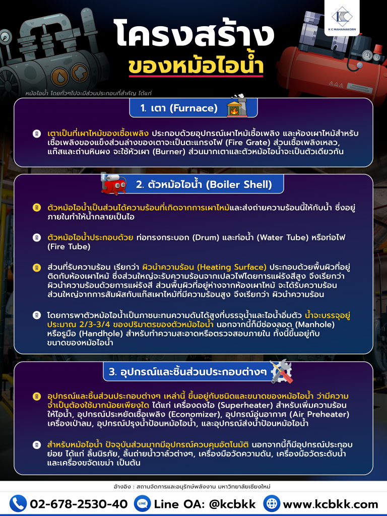 โครงสร้างของหม้อไอน้ำ หม้อไอน้ำ โดยทั่วๆไปจะมีส่วนประกอบที่สำคัญ ได้แก่1. เตา (Furnace) เตาเป็นที่เผาไหม้ของเชื้อเพลิง ประกอบด้วยอุปกรณ์เผาไหม้เชื้อเพลิง และห้องเผาไหม้สำหรับเชื้อเพลิงของแข็งส่วนล่างของเตาจะเป็นตะแกรงไฟ (Fire Grate) ส่วนเชื้อเพลิงเหลว, แก๊สและถ่านหินผงจะใช้หัวเผา (Burner) ส่วนมากเตาและตัวหม้อไอน้ำจะเป็นตัวเดียวกัน2. ตัวหม้อไอน้ำ (Boiler Shell) ตัวหม้อไอน้ำเป็นส่วนได้ความร้อนที่เกิดจากการเผาไหม้และส่งถ่ายความร้อนนี้ให้กับน้ำ ซึ่งอยู่ภายในทำให้น้ำกลายเป็นไอ ตัวหม้อไอน้ำประกอบด้วย ท่อทรงกระบอก (Drum) และท่อน้ำ (Water Tube) หรือท่อไฟ (Fire Tube) ส่วนที่รับความร้อน เรียกว่า ผิวนำความร้อน (Heating Surface) ประกอบด้วยพื้นผิวที่อยู่ติดกับห้องเผาไหม้ ซึ่งส่วนใหญ่จะรับความร้อนจากเปลวไฟโดยการแผ่รังสีสูง จึงเรียกว่า ผิวนำความร้อนด้วยการแผ่รังสี ส่วนพื้นผิวที่อยู่ห่างจากห้องเผาไหม้ จะได้รับความร้อนส่วนใหญ่จากการสัมผัสกับแก๊สเผาไหม้ที่มีความร้อนสูง จึงเรียกว่า ผิวนำความร้อน โดยการพาตัวหม้อไอน้ำเป็นภาชนะทนความดันได้สูงที่บรรจุน้ำและไอน้ำอิ่มตัว น้ำจะบรรจุอยู่ประมาณ 2/3-3/4 ของปริมาตรของตัวหม้อไอน้ำ นอกจากนี้ก็มีช่องลอด (Manhole) หรือรูมือ (Handhole)…